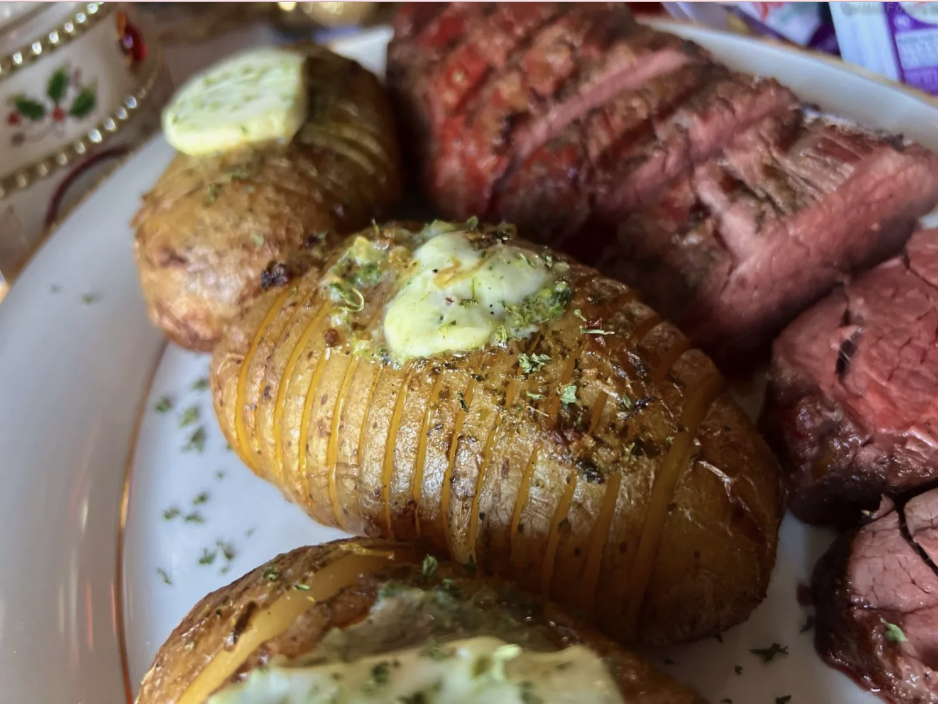 Recently, I cooked a chateaubriand slathered in Dorot Gardens garlic and onion just in time for Christmas. It was the best beef tenderloin I’ve ever had. I also cooked some hasselback potatoes to fill out the plating and I have to say, the potatoes might have been better than the beef. I know that sounds like hyperbole, but I’m not kidding. These potatoes were absolutely addictive! And these things are so simple to make. Grilled hasselback potatoes with compound butter will be going into a regular rotation for my family. This recipe along with that chateaubriand would make you the rock star of your Christmas dinner.