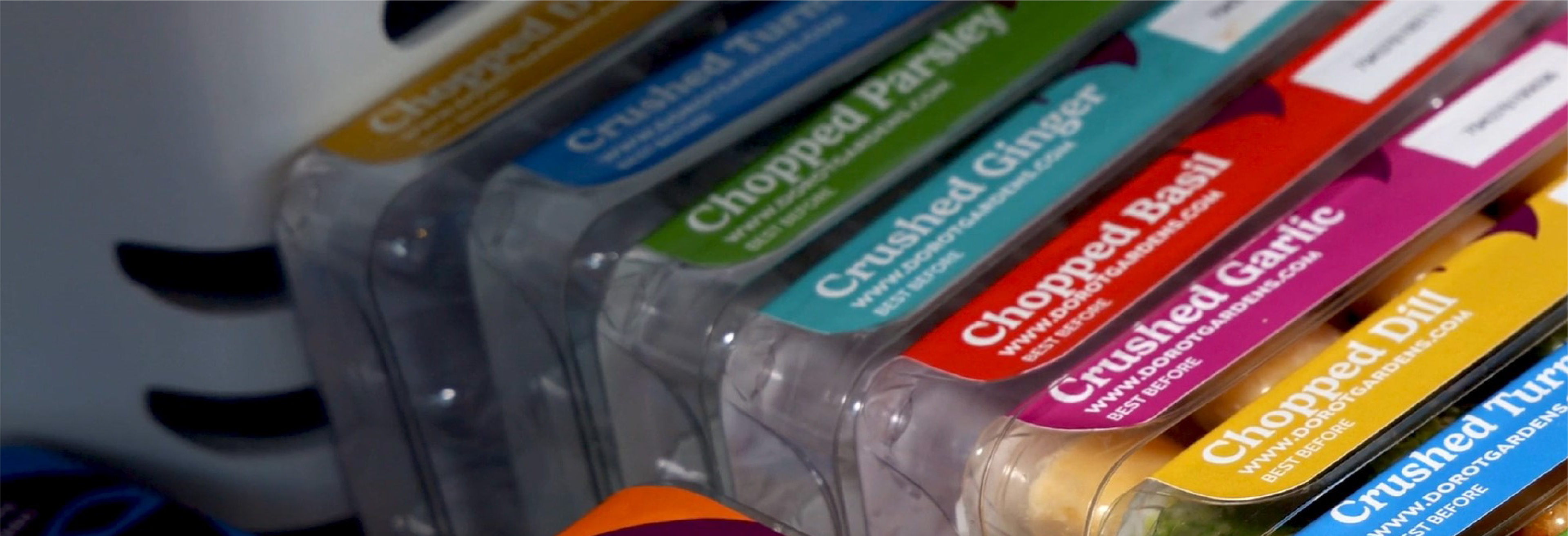 Dorot Gardens: Variety of flash-frozen herb and garlic cubes in colorful packaging. Fresh herbs and garlic nearby.