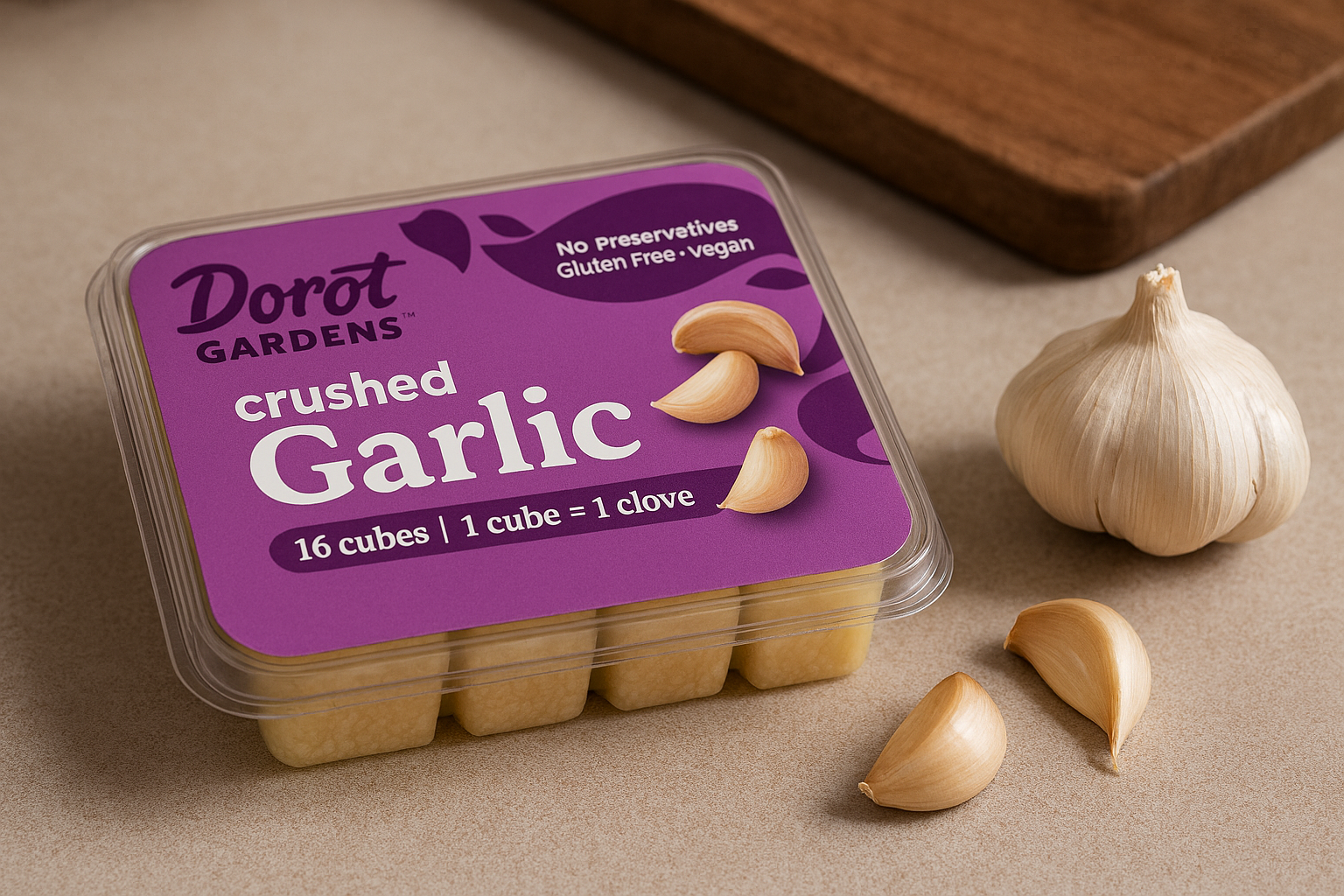 Dorot Gardens makes packed garlic easy to use and easy to keep on hand. Our pre-packaged frozen garlic comes in frozen trays, stays ready in the freezer, and gives you the same portion every time.
