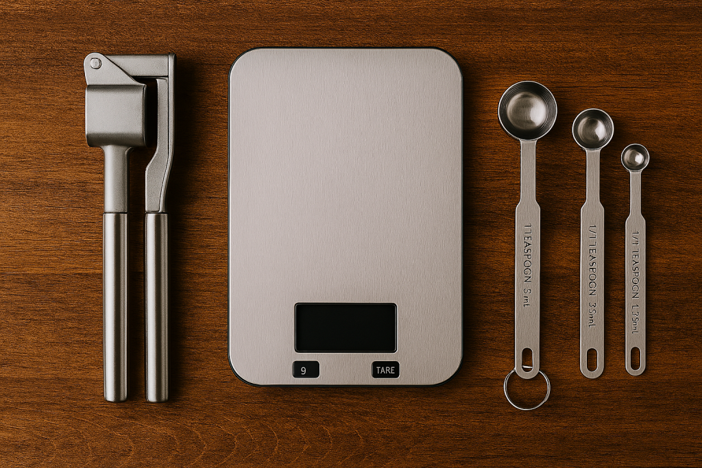A digital kitchen scale makes baking and portioning effortless. Stainless steel measuring spoons and cups keep recipes consistent. A quality meat thermometer or multi-timer helps prevent overcooking and keeps weeknight meals stress-free.